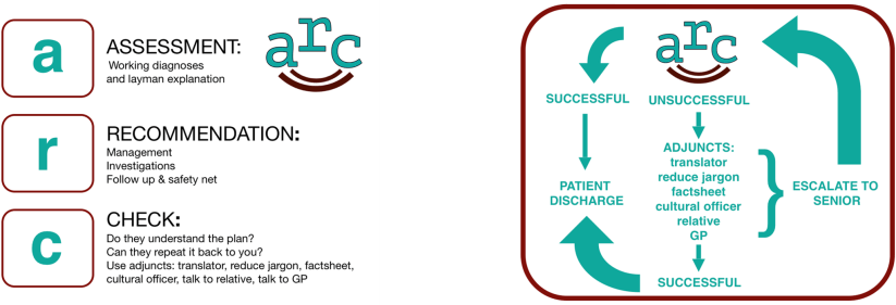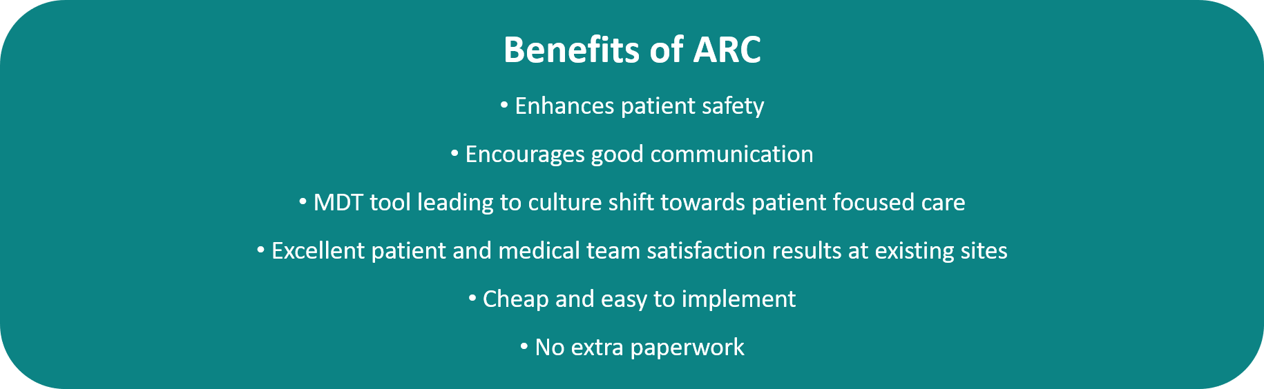 ARC is a Healthcare Professional to Patient verbal communication tool adapted from ISBAR. It can be used by any multi-disciplinary team (MDT) member. Designed to be used at the point of discharge home or admission to the wards. ARC is a succinct way to clarify the salient points of a consultation and check patient understanding.
